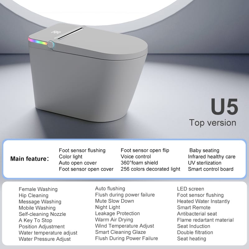 The AiΒ Top Version Smart Toilet is designed for those who demand the ultimate in hygiene, automation, and luxury. Packed with advanced features like foot sensor flushing, voice control, UV sterilization, and 256-color ambient lighting, this smart toilet redefines your daily bathroom experience.